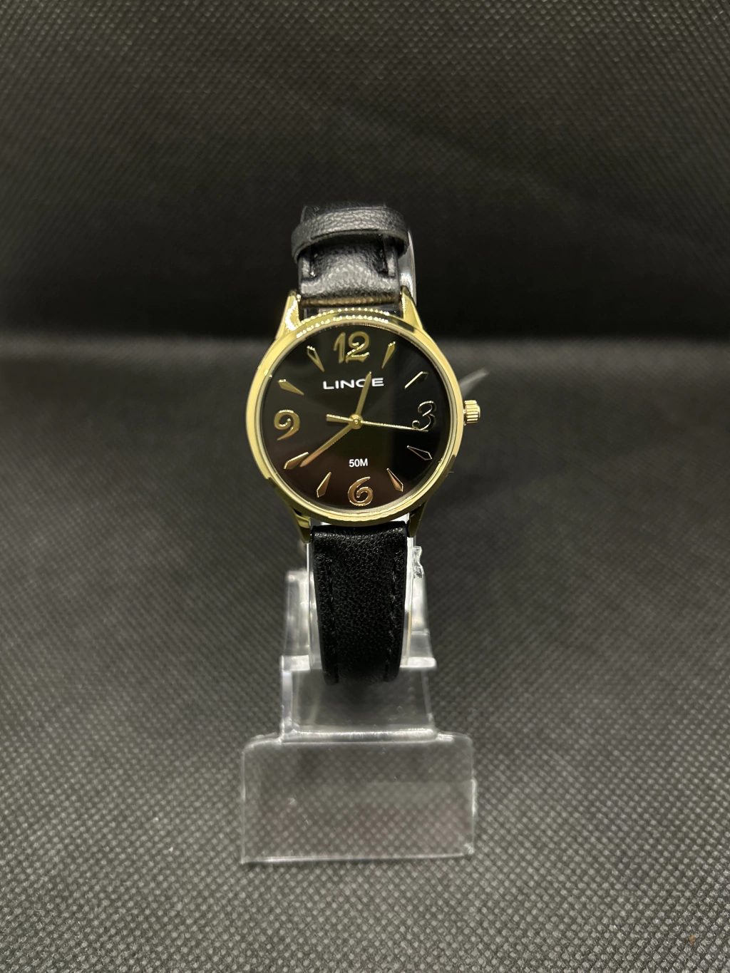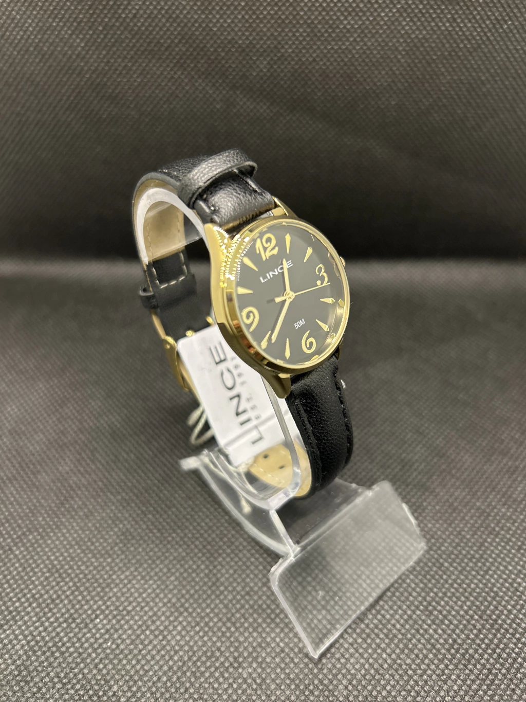 Relógio lince redondo dourado com pulseira em couro